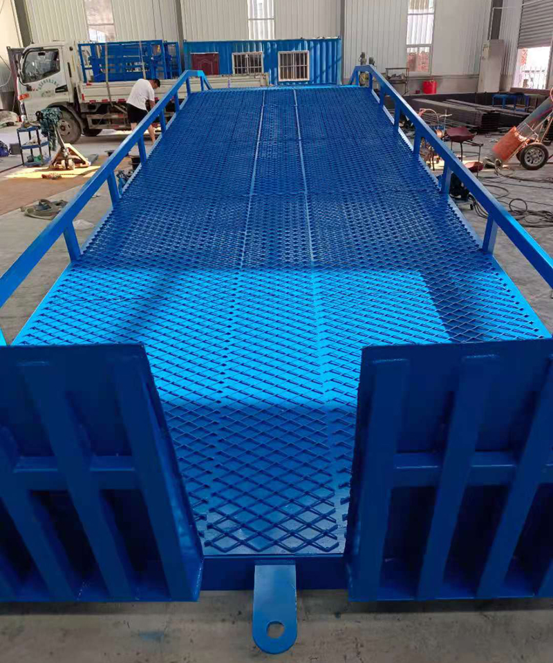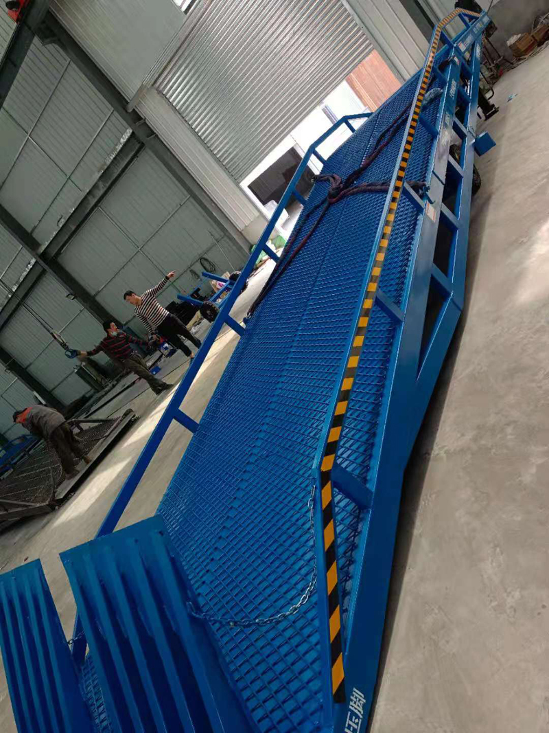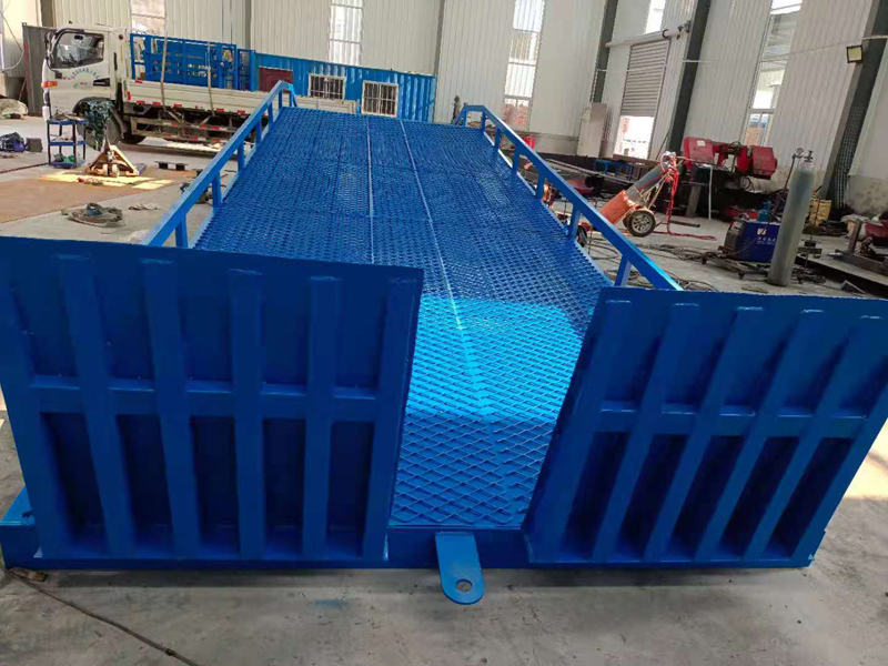 移動式登車橋在現代物流現場已是一非常易見的結構形式,它是企業物流鏈的起點與終點,是企業快速、安全周轉產品及貨物的一個裝卸貨操作平臺。 裝卸貨操作平臺的高度固定,但來往運輸車廂的廂地高度不一,運輸車輛與裝卸貨站臺之間總是形成一定的高度落差或間隙。造成搬運叉車不能進出運輸車輛直接裝卸貨物。運用登車橋提供可靠的連接。使搬運叉車能夠安全、快速地進出運輸車輛進行裝卸貨作業。使用過程平穩可靠,安全性能高,裝卸貨物時節約了大量時間,省卻了大量人力,使裝卸貨物大大的提高了效率。臺面采用特制的菱形網格板有可靠的強度,能保證長期使用而不變形。它的菱形網狀結構,充分保證了防滑性能,使叉車有更好的爬坡性和可操縱性,即使在雨、雪天氣,仍能保證正常使用。